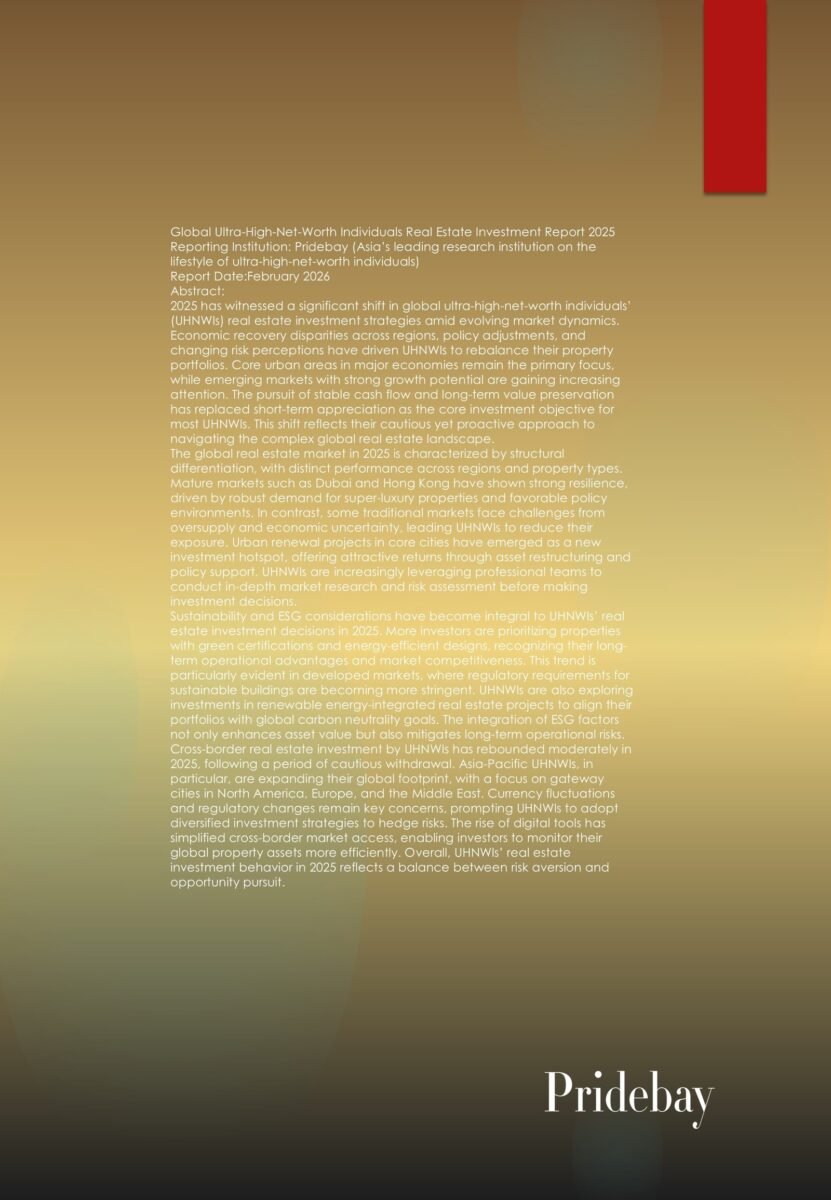 Global Ultra-High-Net-Worth Individuals Real Estate Investment Report 2025 Reporting Institution: Pridebay (Asia’s leading research institution on the lifestyle of ultra-high-net-worth individuals) Report Date:February 2026 Abstract: 2025 has witnessed a significant […]
