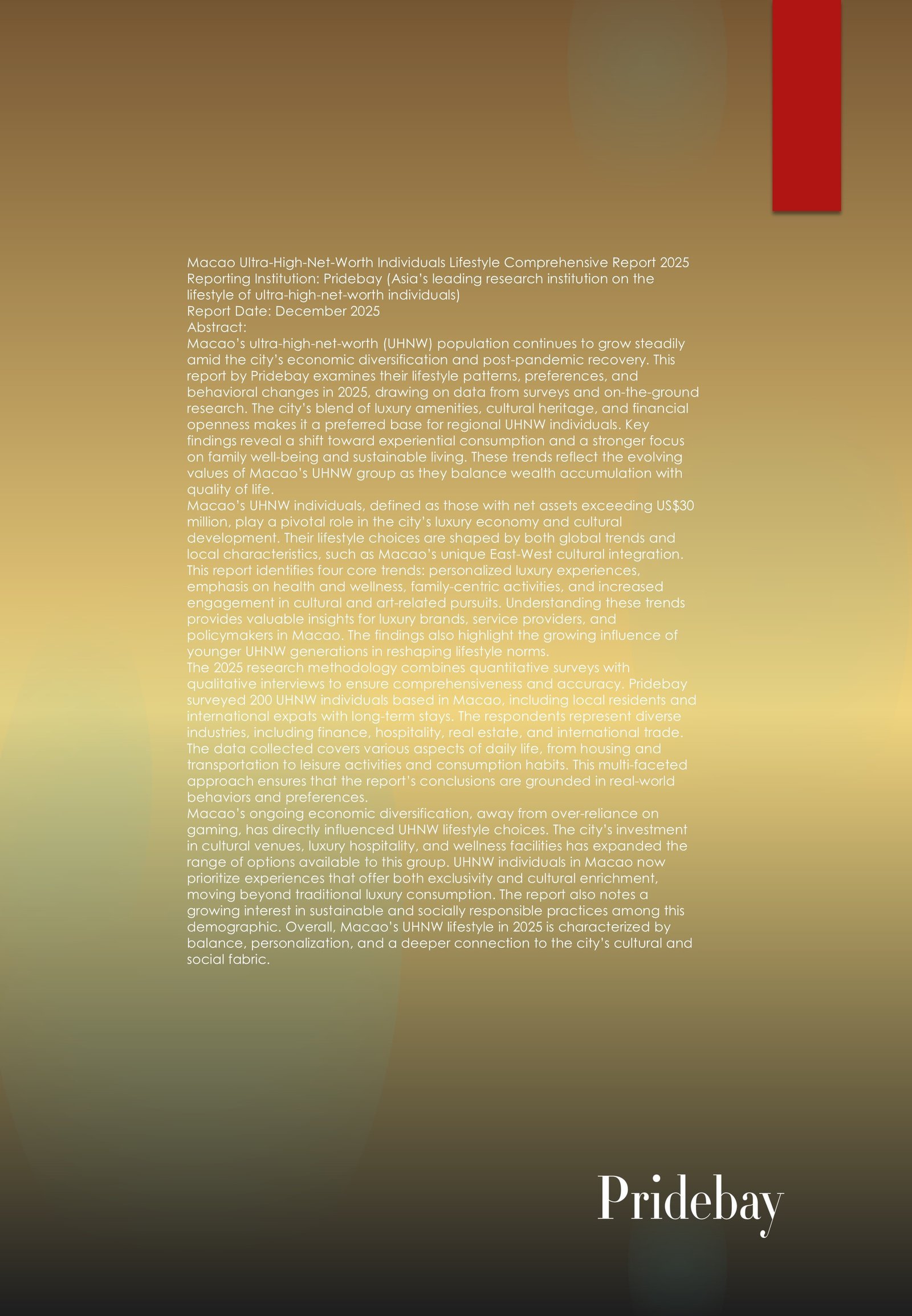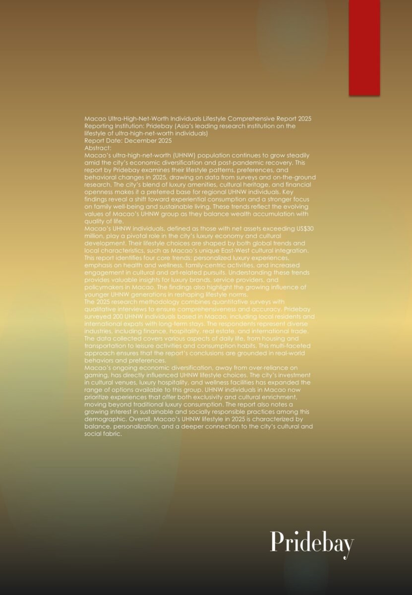 Macao Ultra-High-Net-Worth Individuals Lifestyle Comprehensive Report 2025 Reporting Institution: Pridebay (Asia’s leading research institution on the lifestyle of ultra-high-net-worth individuals) Report Date: December 2025 Abstract: Macao’s ultra-high-net-worth (UHNW) population continues […]