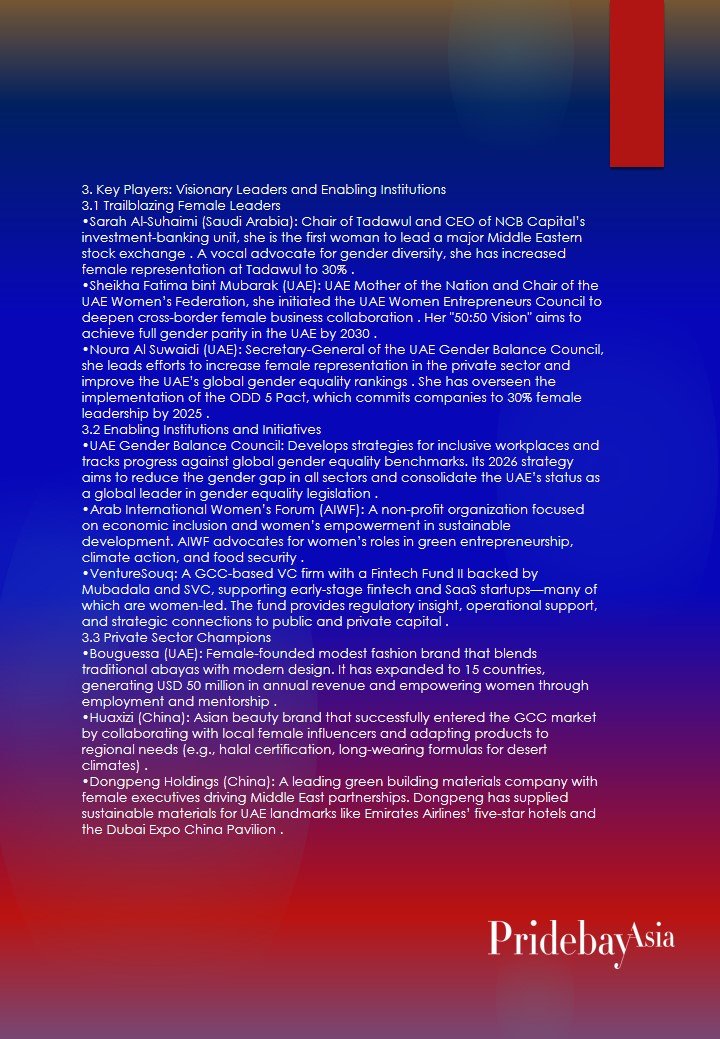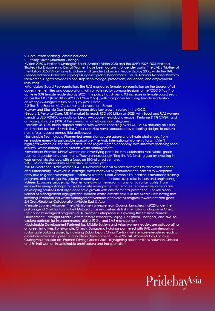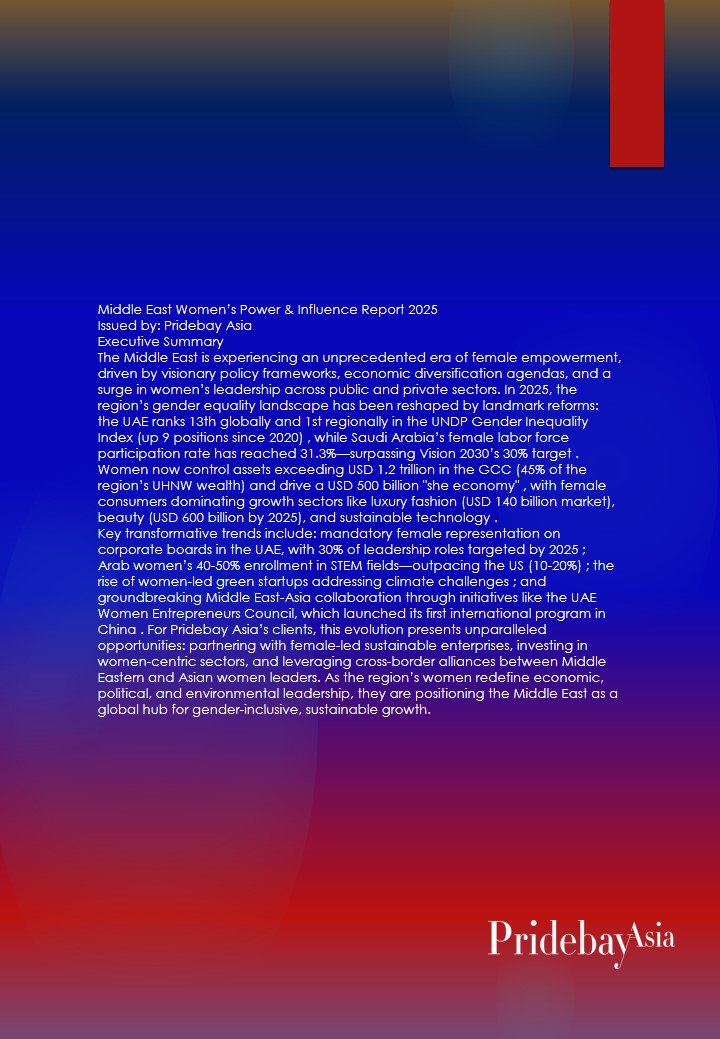 The Middle East’s women are undergoing a historic transformation—emerging as economic powerhouses, sustainability leaders, and cross-regional collaborators. Driven by visionary policies, educational excellence, and a commitment to sustainable growth, they are redefining the region’s trajectory and creating unprecedented opportunities for global partnership. For Pridebay Asia’s clients, this shift presents three key avenues for engagement:
