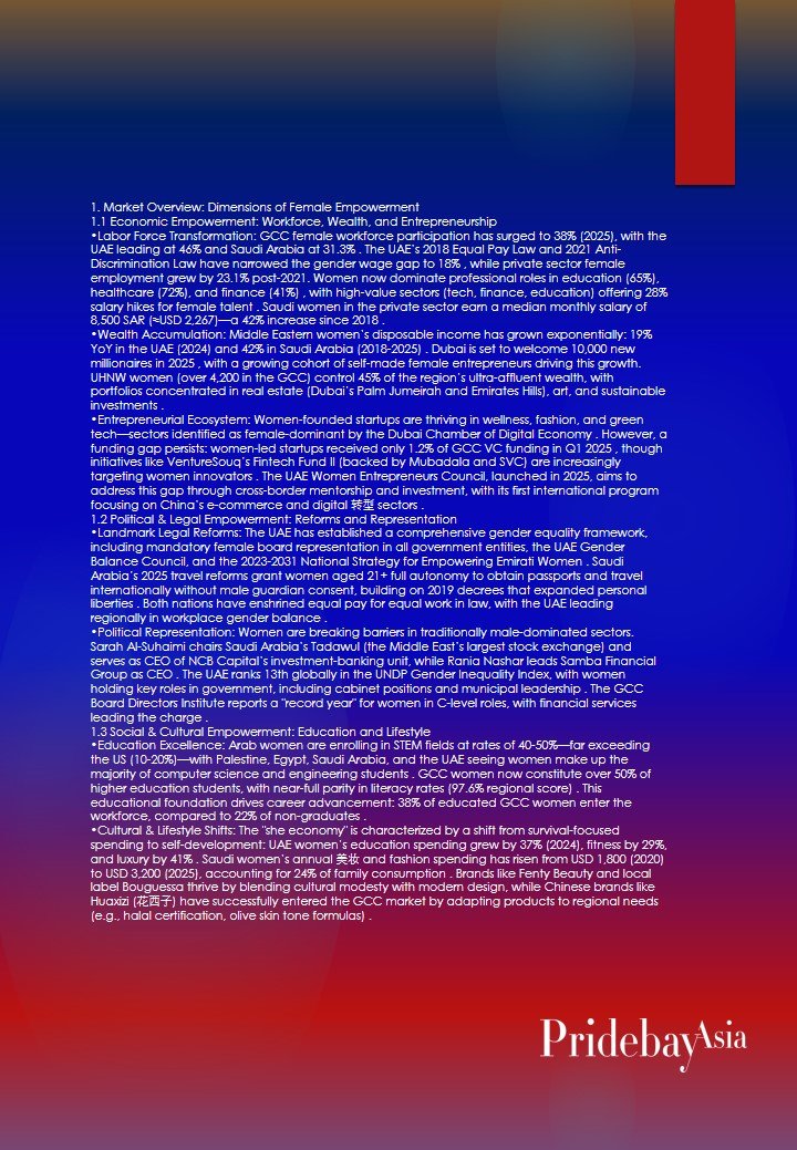 The Middle East is experiencing an unprecedented era of female empowerment, driven by visionary policy frameworks, economic diversification agendas, and a surge in women’s leadership across public and private sectors. In 2025, the region’s gender equality landscape has been reshaped by landmark reforms: the UAE ranks 13th globally and 1st regionally in the UNDP Gender Inequality Index (up 9 positions since 2020) , while Saudi Arabia’s female labor force participation rate has reached 31.3%—surpassing Vision 2030’s 30% target . Women now control assets exceeding USD 1.2 trillion in the GCC (45% of the region’s UHNW wealth) and drive a USD 500 billion “she economy” , with female consumers dominating growth sectors like luxury fashion (USD 140 billion market), beauty (USD 600 billion by 2025), and sustainable technology .
