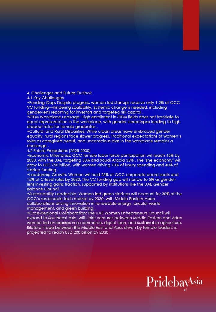 - Sustainability Leadership: Women-led green startups will account for 30% of the GCC’s sustainable tech market by 2030, with Middle Eastern-Asian collaborations driving innovation in renewable energy, circular waste management, and green building .