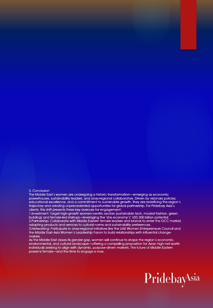 As the Middle East closes its gender gap, women will continue to shape the region’s economic, environmental, and cultural landscape—offering a compelling proposition for Asian high-net-worth individuals seeking to align with dynamic, purpose-driven markets. The future of Middle Eastern power is female—and the time to engage is now.