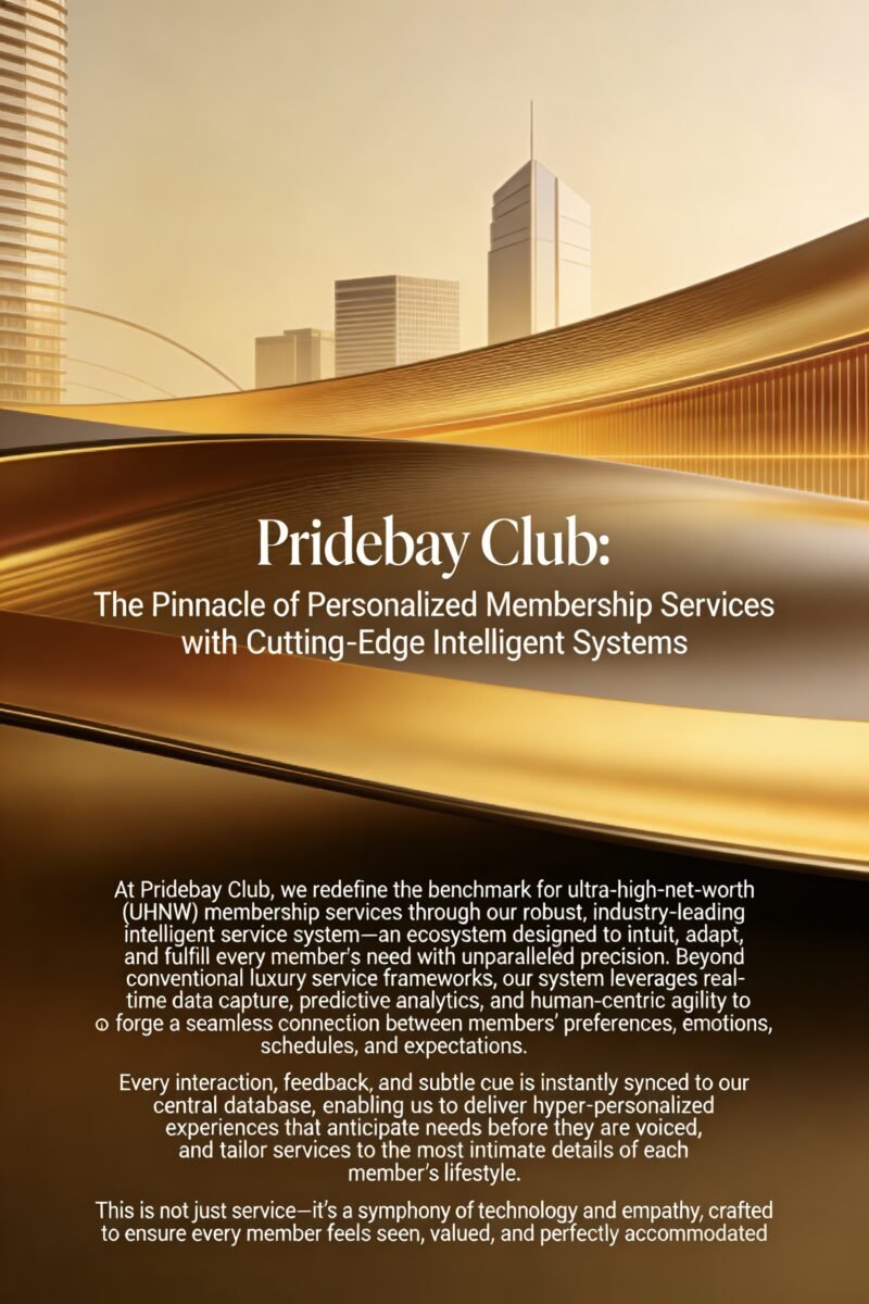 At Pridebay Club, we redefine the benchmark for ultra-high-net-worth (UHNW) membership services through our robust, industry-leading intelligent service system—an ecosystem designed to intuit, adapt, and fulfill every member’s need with unparalleled precision. Beyond conventional luxury service frameworks, our system leverages real-time data capture, predictive analytics, and human-centric agility to forge a seamless connection between members’ preferences, emotions, schedules, and expectations. Every interaction, feedback, and subtle cue is instantly synced to our central database, enabling us to deliver hyper-personalized experiences that anticipate needs before they are voiced, and tailor services to the most intimate details of each member’s lifestyle. This is not just service—it’s a symphony of technology and empathy, crafted to ensure every member feels seen, valued, and perfectly accommodated.
