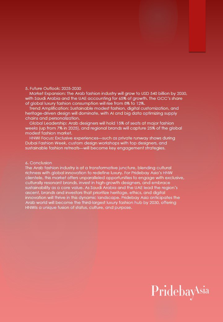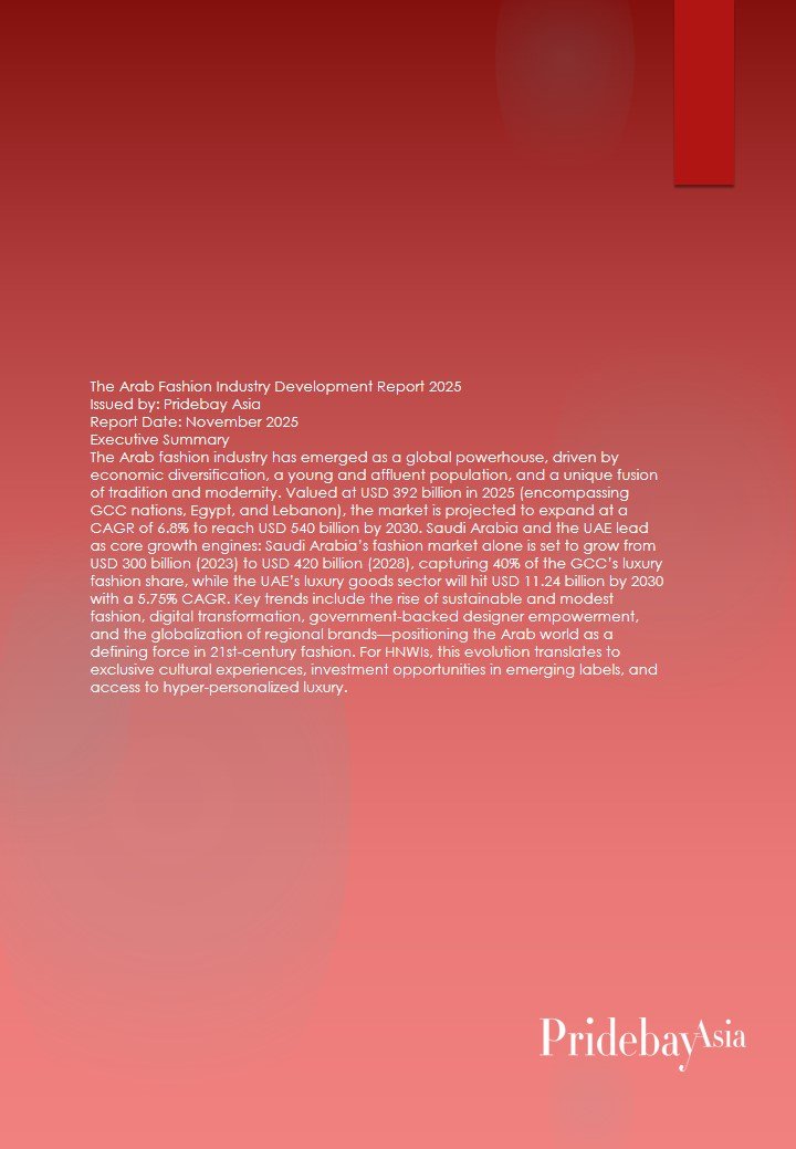 The Arab fashion industry is at a transformative juncture, blending cultural richness with global innovation to redefine luxury. For Pridebay Asia’s HNW clientele, this market offers unparalleled opportunities to engage with exclusive, culturally resonant brands, invest in high-growth designers, and embrace sustainability as a core value. As Saudi Arabia and the UAE lead the region’s ascent, brands and investors that prioritize heritage, ethics, and digital innovation will thrive in this dynamic landscape. Pridebay Asia anticipates the Arab world will become the third-largest luxury fashion hub by 2030, offering HNWIs a unique fusion of status, culture, and purpose.