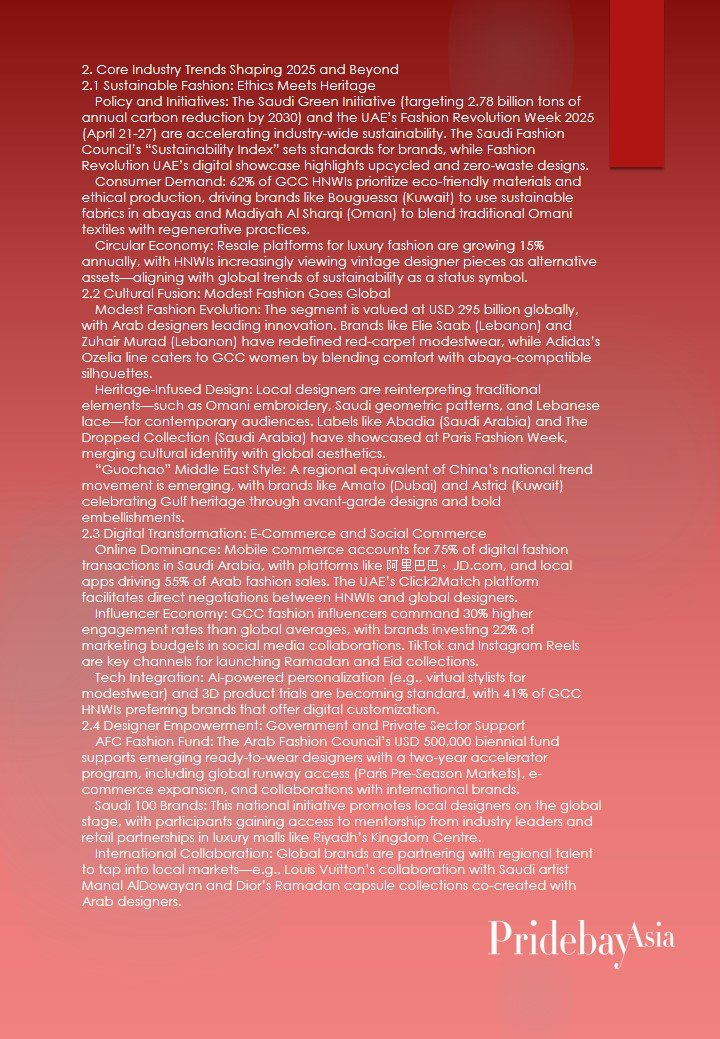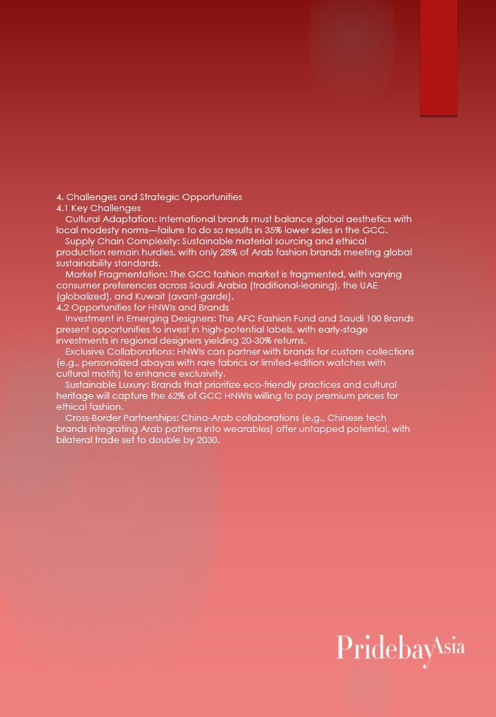 - Sustainable Luxury: Brands that prioritize eco-friendly practices and cultural heritage will capture the 62% of GCC HNWIs willing to pay premium prices for ethical fashion.