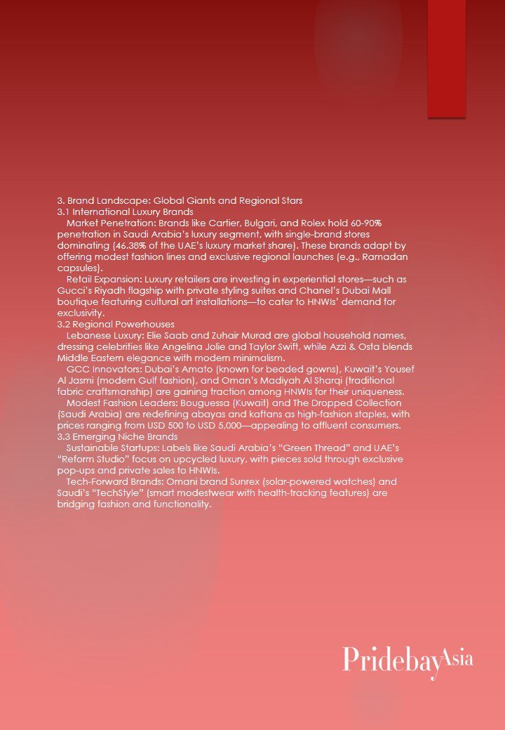 - Tech Integration: AI-powered personalization (e.g., virtual stylists for modestwear) and 3D product trials are becoming standard, with 41% of GCC HNWIs preferring brands that offer digital customization.